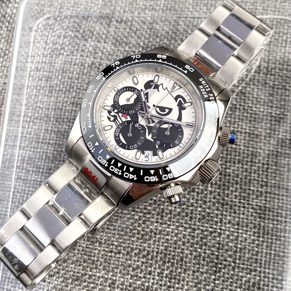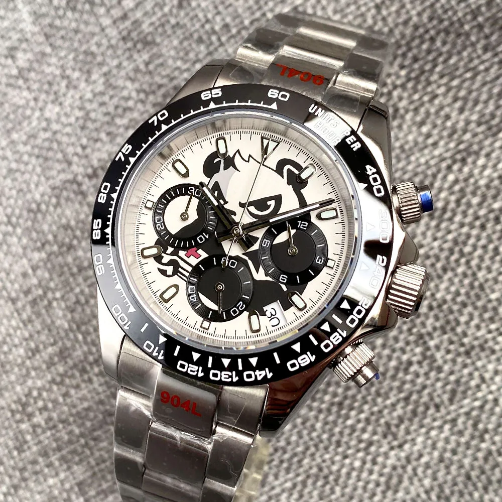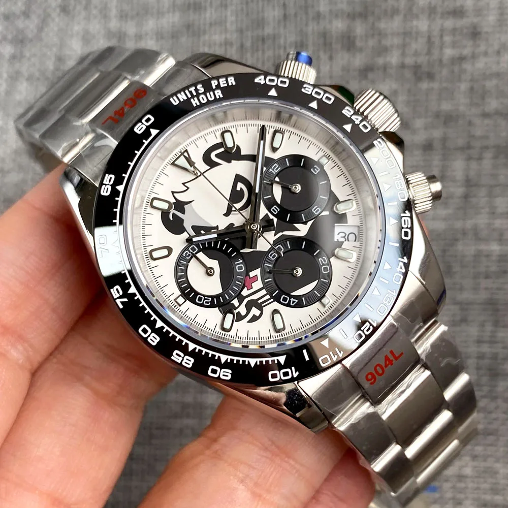 Fashion 39mm Quartz Chronograph Sapphire Crystal Men's Watch VK63 Cartoon Printing Pattern Stainless Steel White Black Dial